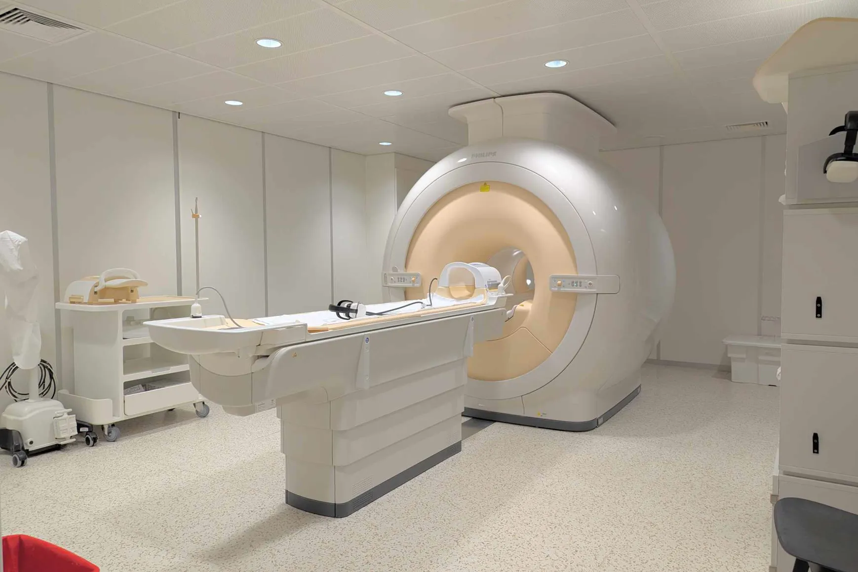 Slik ser MR-maskinen vår ut. Når bildene tas ligger du på benken som blir kjørt inn i tunnelen. Tunnelen er alltid åpen i begge ender.